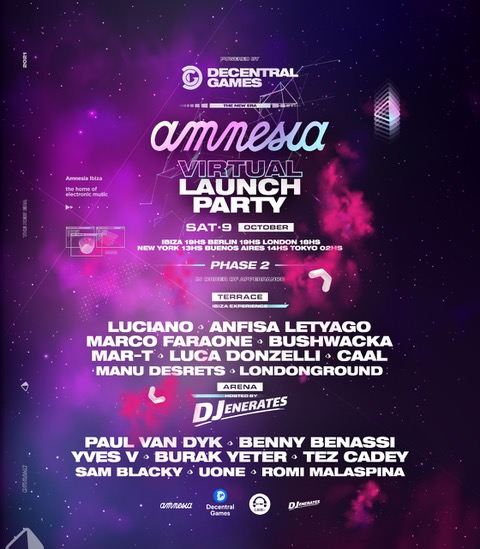 On 9th October, Benny Benassi, Paul van Dyk, Anfisa Letyago and Luciano will share the world famous Terrace of Amnesia’s virtual superclub and the new Arena Stage hosted by Djenerates in a virtual venue located in Decentral Games, the world’s first immersive 3D metaverse experience of its kind on the blockchain. This is a mouthwatering event for fans of Amnesia who cannot travel to the much anticipated and upcoming closing party out in Ibiza.